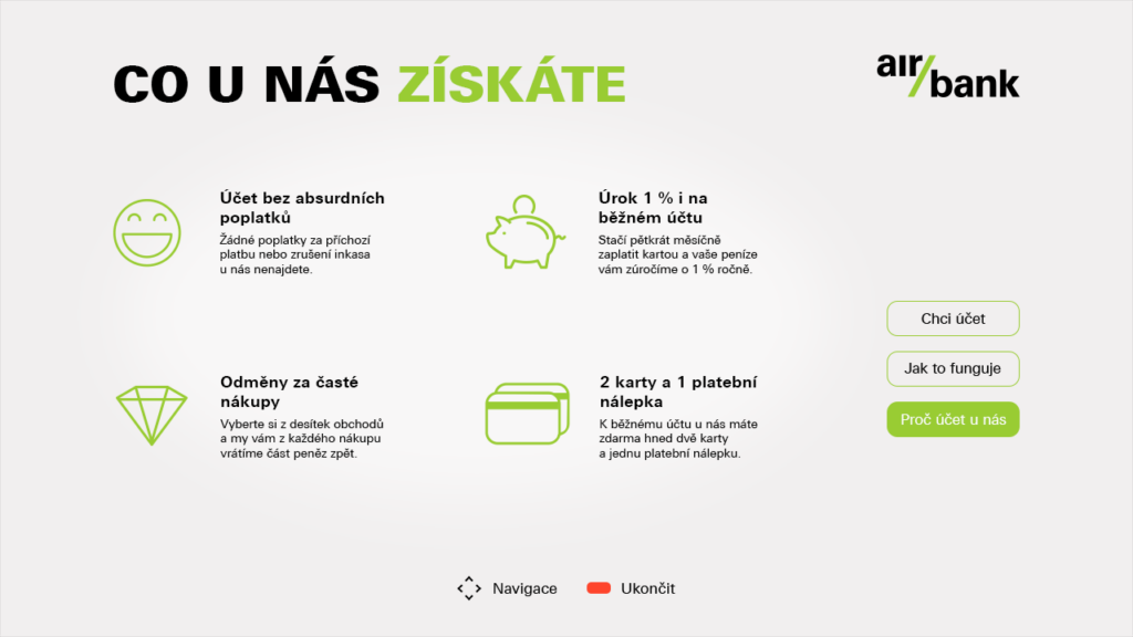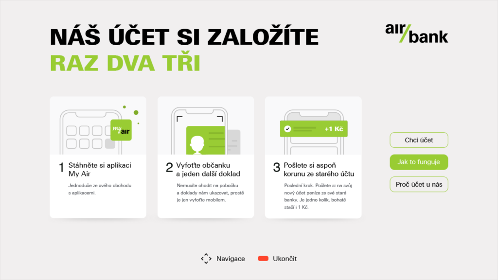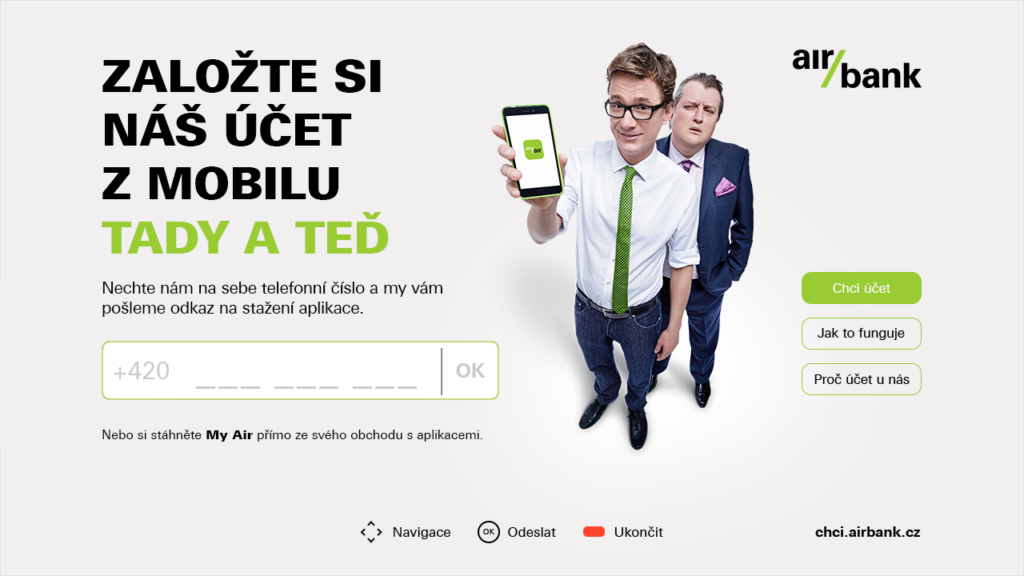 A brand new interactive HbbTV application for Air Bank. The application invites viewers to create a bank account with a mobile app and shows them the Air Bank account benefits. Viewers obtain the link to download My Air mobile app after inserting their phone number into the interactive contact form on the HbbTV home page.